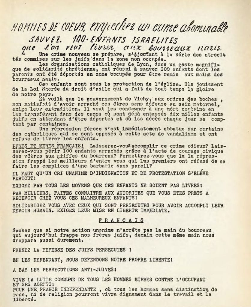 Celui-ci, mis devant le fait accompli, est donc tenu de couvrir le Père Chaillet au nom de “l’obligation morale impérieuse”. Dans les heures qui suivent, la police se lance à la poursuite des enfants mais la Résistance répond dans un tract : “Vous n’aurez pas les enfants”. La plupart sont ensuite répartis dans des familles sous de nouvelles identités. La majorité des parents (545) seront gazés.