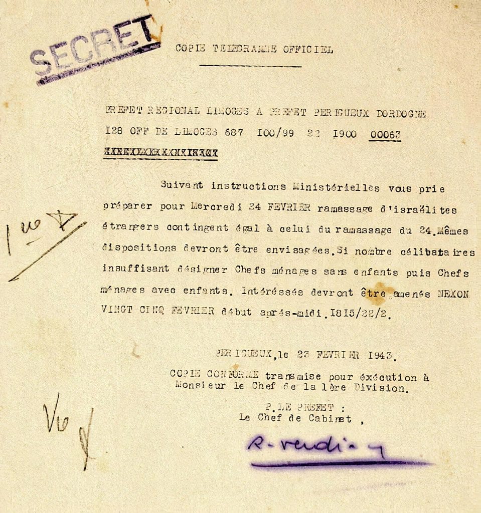 Copie d’un télégramme (23 févr.1943) du préfet régional de Limoges au préfet de Périgueux sur le « ramassage » des Juifs étrangers et les modalités de leur sélection.