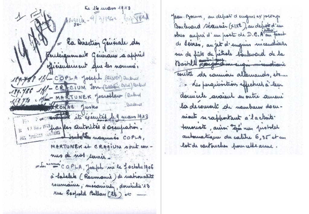 La Direction des renseignements généraux annonce l’exécution par les Allemands de trois « terroristes » et relate leurs actions à Paris (16 mars 1943).