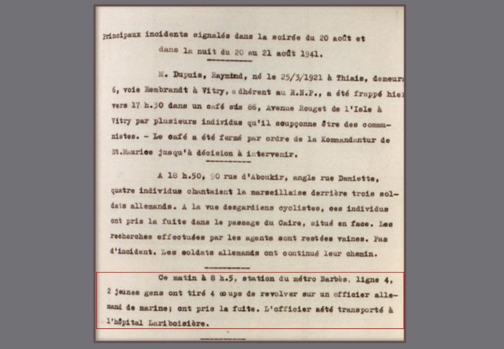Extrait d’un rapport de police sur les activités communistes (20-21 août 1941), relatant l’attentat à la station de métro Barbès-Rochechouart.