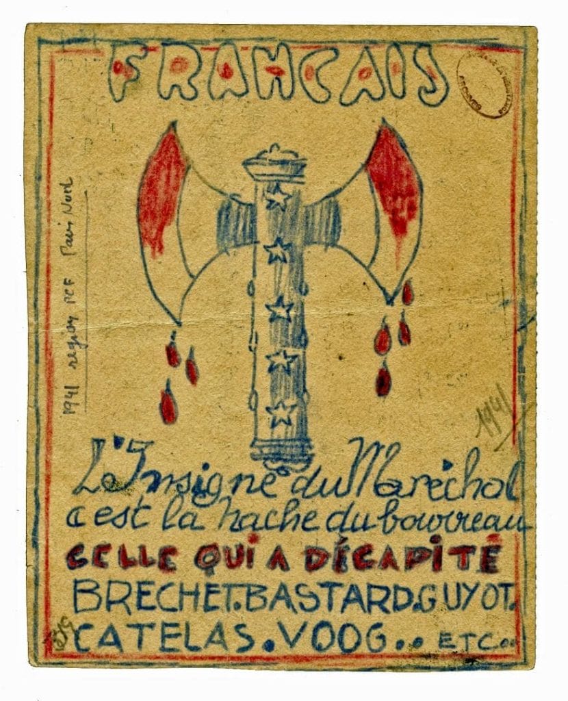 Tract communiste de 1941 détournant le symbole pétainiste de la francisque après l’exécution de militants communistes condamnés à la décapitation par un tribunal français.
