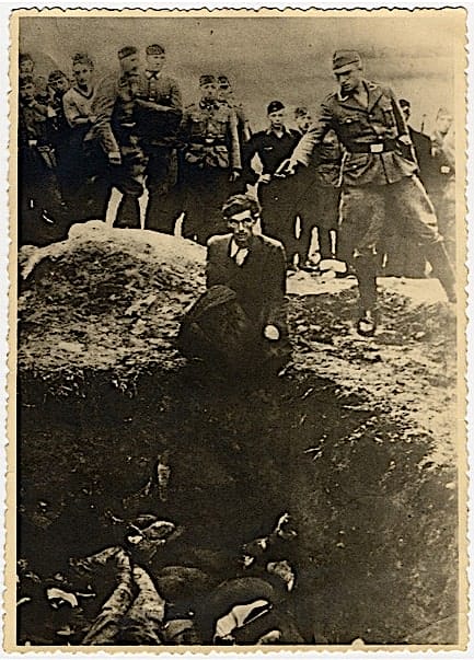 Exécution de Juifs par les SS de l’Einsatzgruppe D et des miliciens ukrainiens. Photo prise par un nazi, titrée « le dernier juif de Vinnytsia ». (septembre 1941).