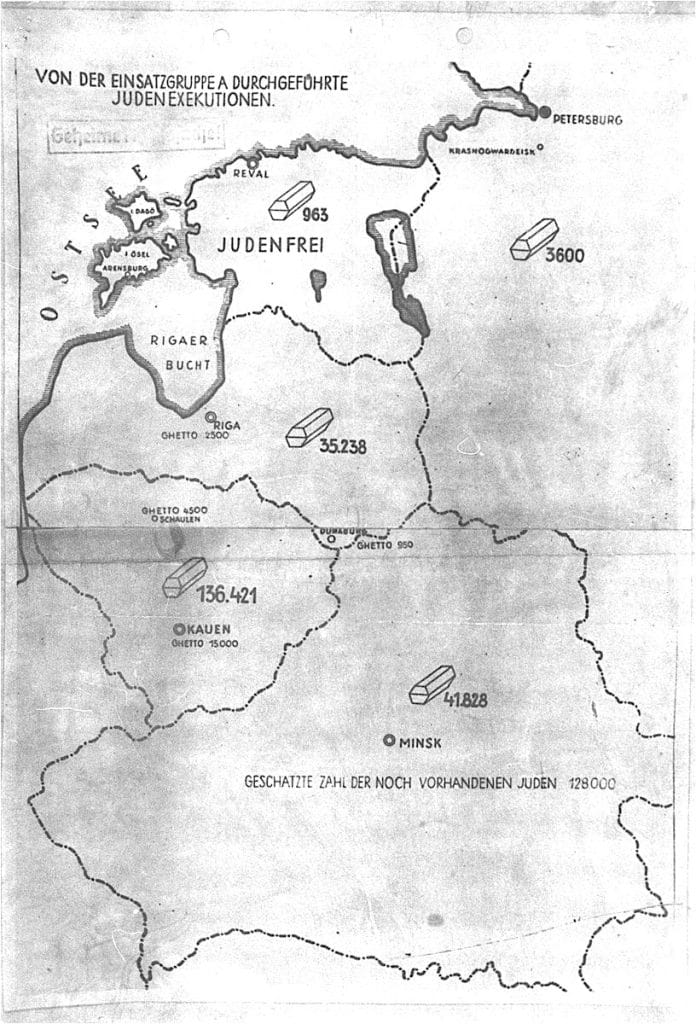 Carte dressée par l’Einsatzgruppe A, relatant les exécutions de Juifs dans les Pays baltes entre l’été 1941 et janvier 1942 (Shoah par balles).