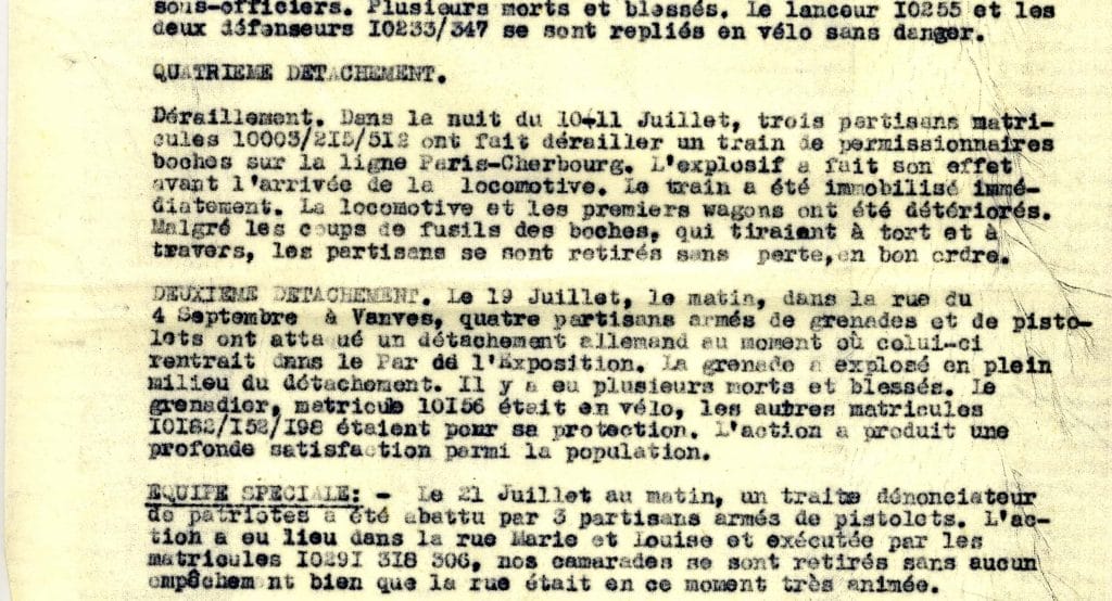 Extrait d’un rapport d’activité de 1943 du quatrième détachement FTP-M.O.I. : déraillement à l’explosif d’un train transportant des permissionnaires allemands dans la nuit du 10-11 juillet.