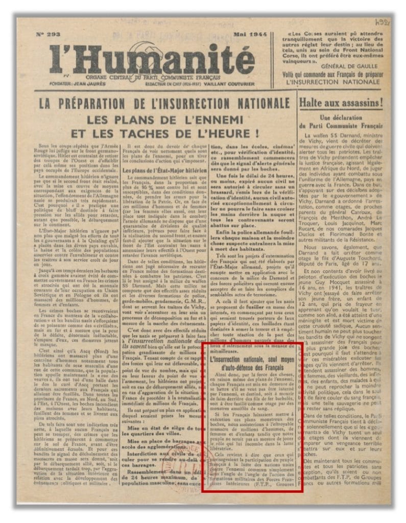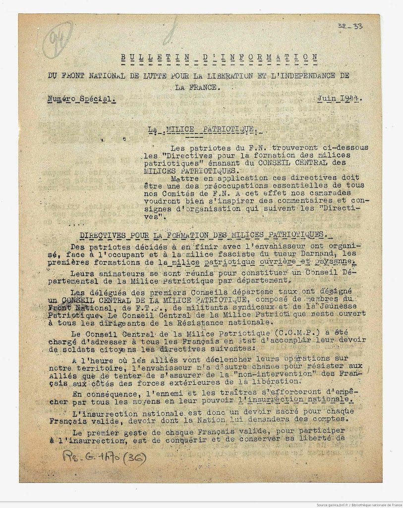 Bulletin d’information du Front National, juin 1944 : directives pour la formation de Milices patriotiques.