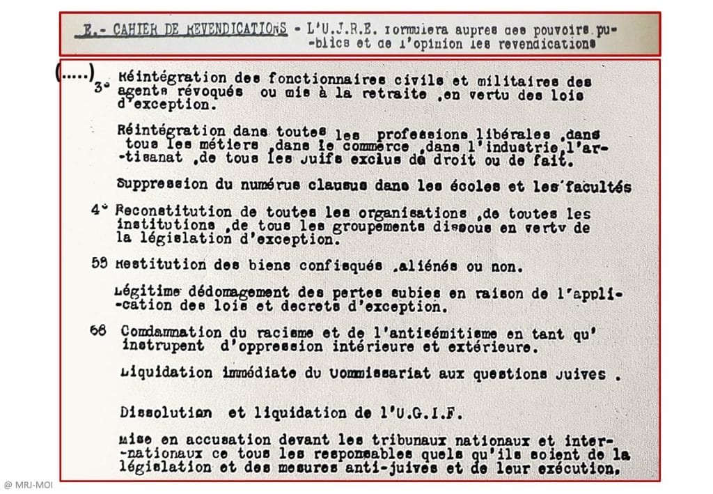 Revendications de l’UJRE pour que les « Juifs retrouvent une vie d’hommes libres dans une France libérée »(avril 1944).