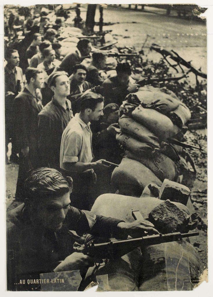 Libération de Paris : barricade à l’angle des boulevards Saint-Germain et Saint-Michel, le 23 août 1944 ; photo de Robert Doisneau.
