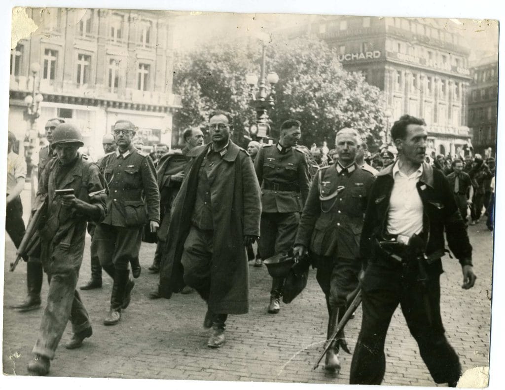 Place de l’Opéra, à Paris : officiers allemands de la Kommandantur der Gross-Paris, prisonniers (25 août 1944).