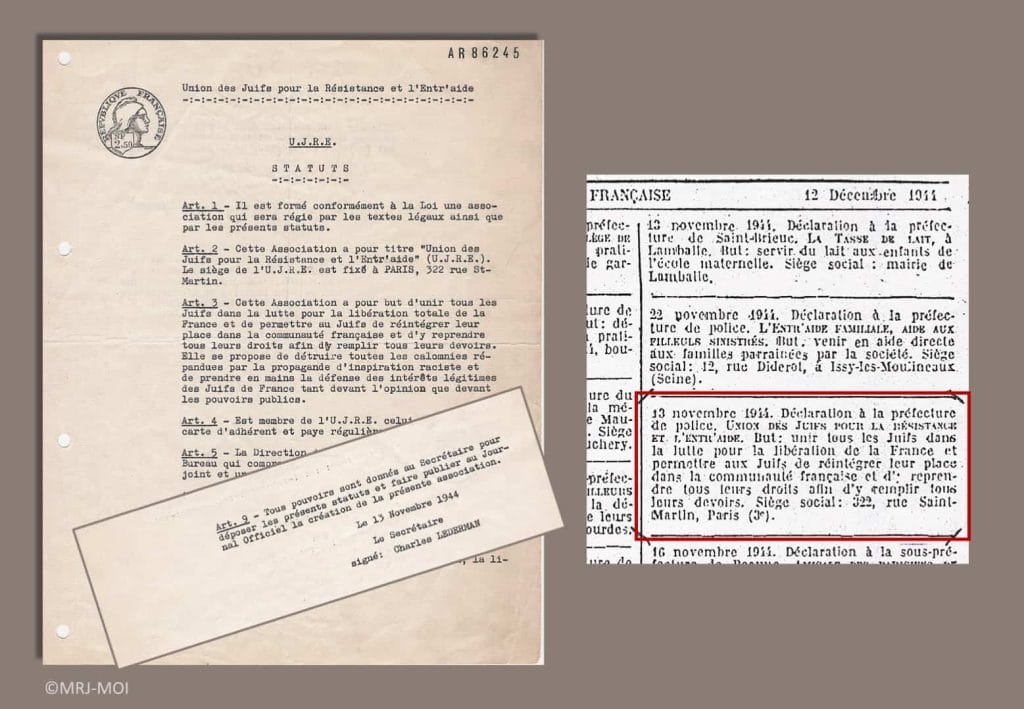 Le 13 novembre 1944, déclaration à la Préfecture de police de la création officielle de l’UJRE (Journal Officiel du 12 décembre 1944). Extraits des statuts de l’UJRE.