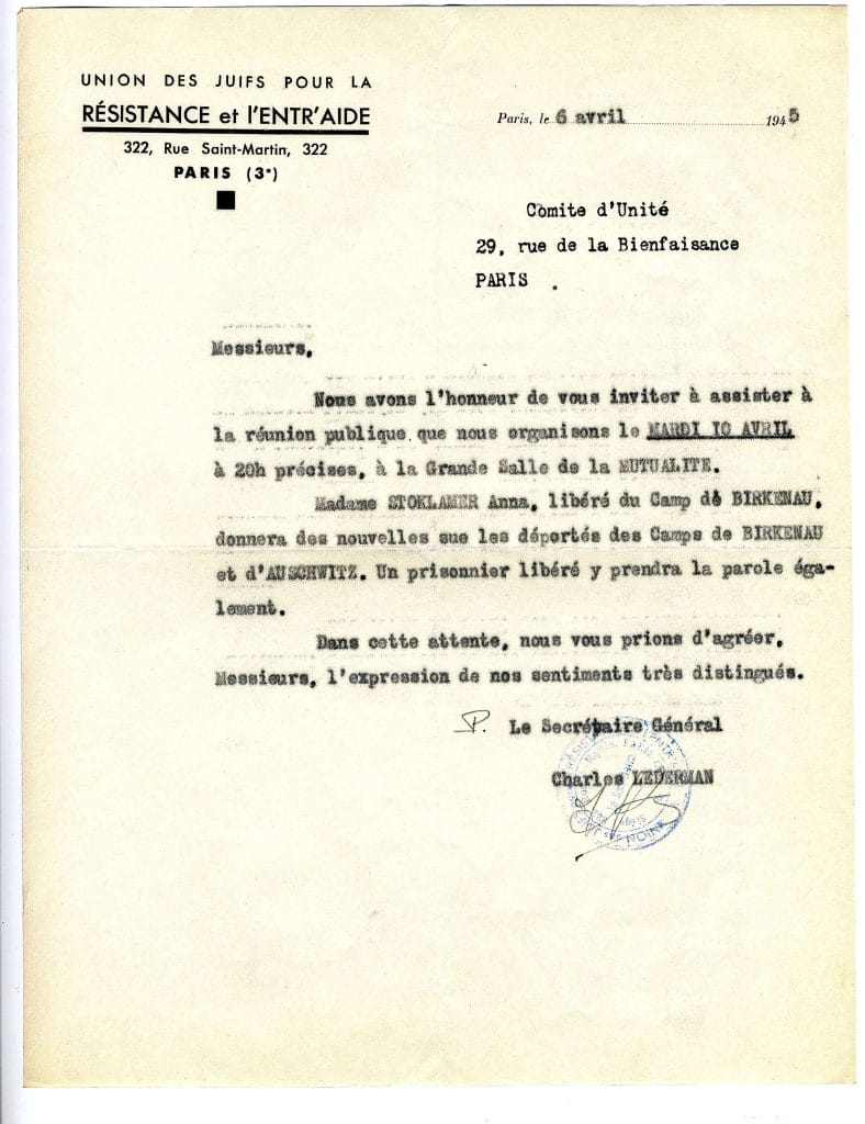 L’UJRE annonce une réunion à la Mutualité (Paris 5e arr.), le 10 avril 1945, où Anna Stoklamer, rescapée, donnera des informations sur les déportés d’Auschwitz et de Birkenau.