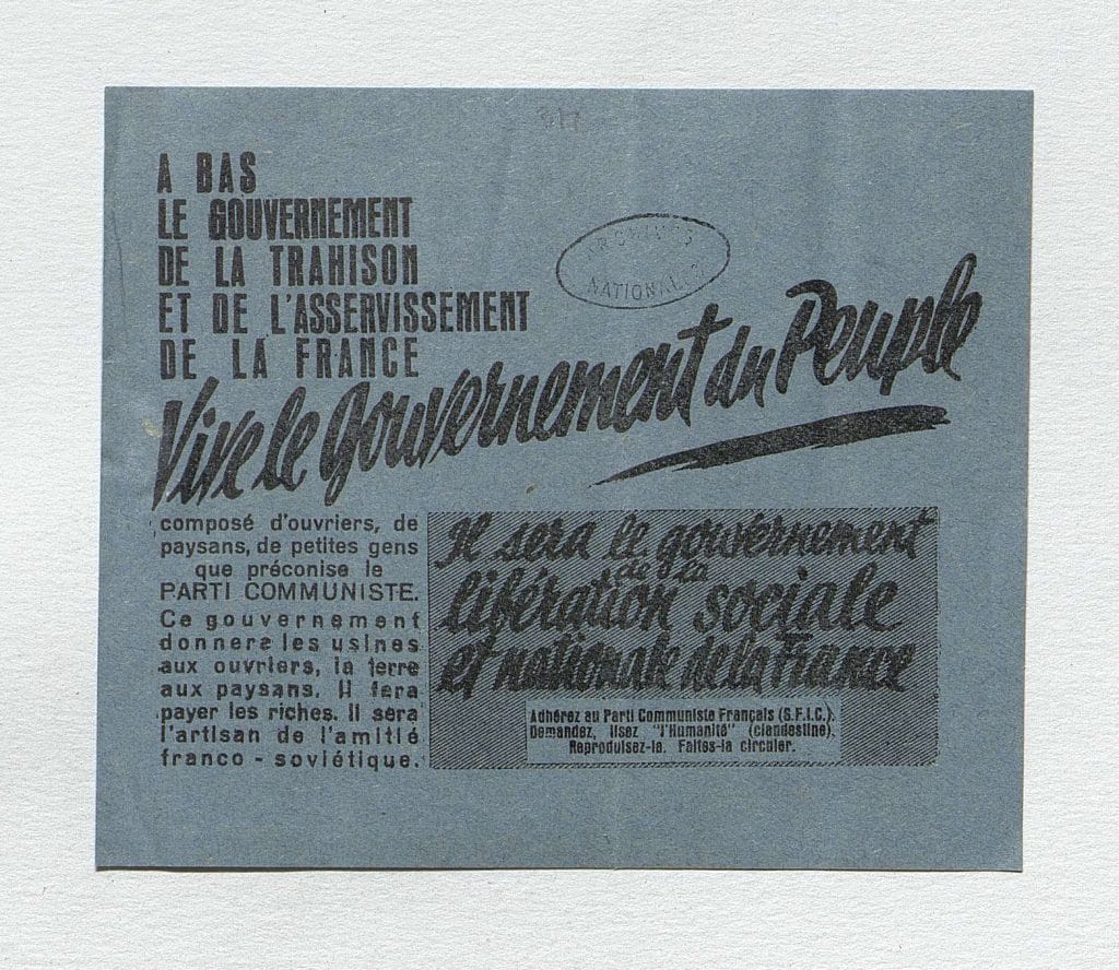 Tract diffusé par le Parti communiste clandestin dénonçant la politique de collaboration du maréchal Pétain et appelle au gouvernement du peuple.