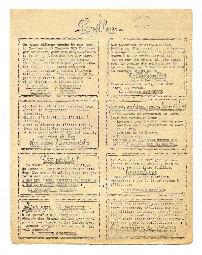 Papillons clandestins des Jeunesses communistes (printemps 1941).