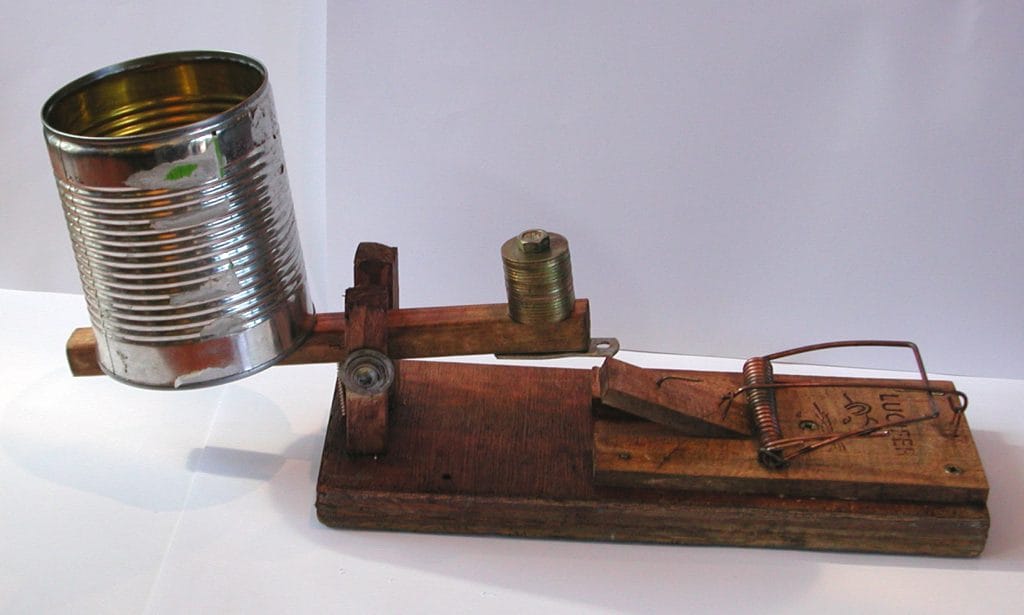 Dispositif utilisé par les résistants communistes pour la projection retardée de tracts : l’eau de la boîte s’écoule, le piège à souris se détend et expédie les tracts.