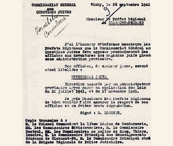Le 26 septembre 1942, le Commissariat général aux questions juives organise l’ « aryanisation » des « entreprises juives » dans le Puy-de-Dôme.