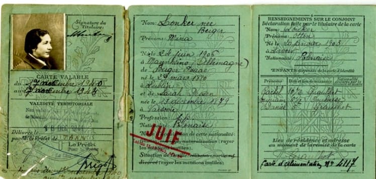 Carte d’identité d’étranger de Mina L. En zone non occupée, Vichy décide de faire tamponner les cartes des personnes de « race juive » de la mention « JUIF » en rouge.