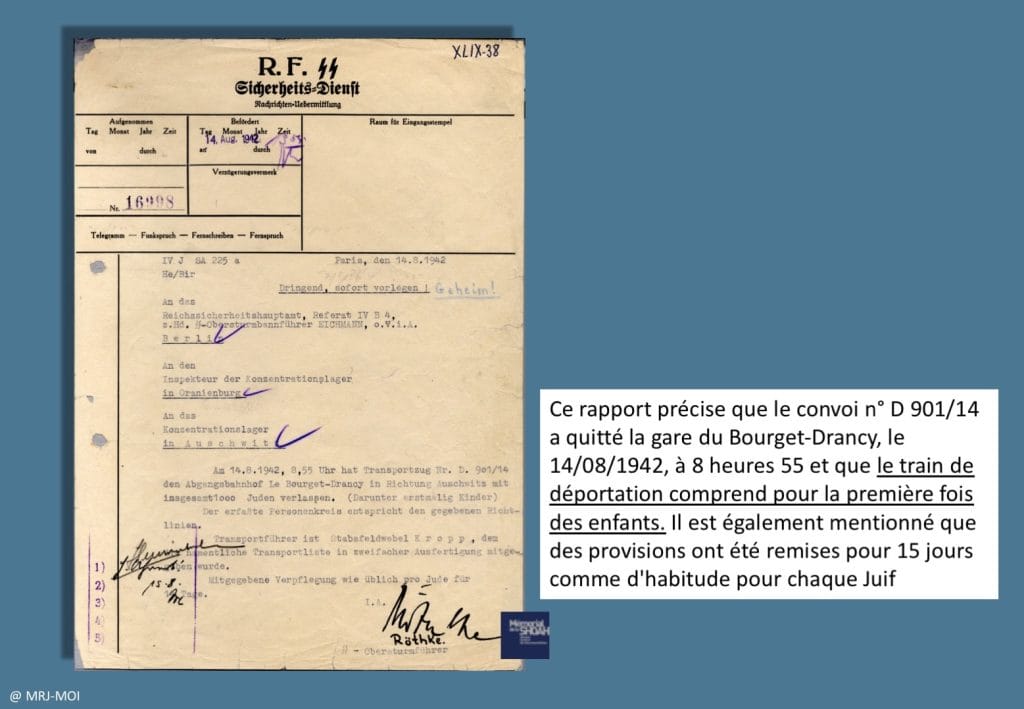 Rapport du 14/08/1942, du SS-Obersturmführer H. Röthke à A. Eichmann, relatif à la déportation de 1.000 Juifs à Auschwitz, précisant que ce convoi comprend pour la 1ère fois des enfants.