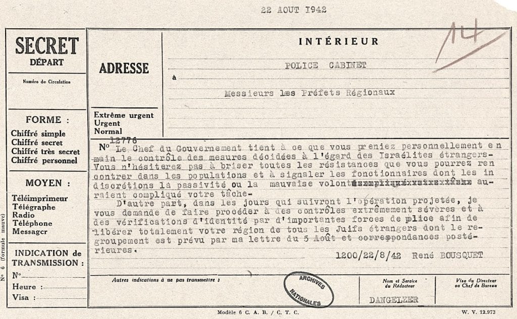 Télégramme de René Bousquet, secrétaire général de la police de Vichy aux préfets, exigeant de libérer totalement leur région de tous les Juifs étrangers (22 août 1942).