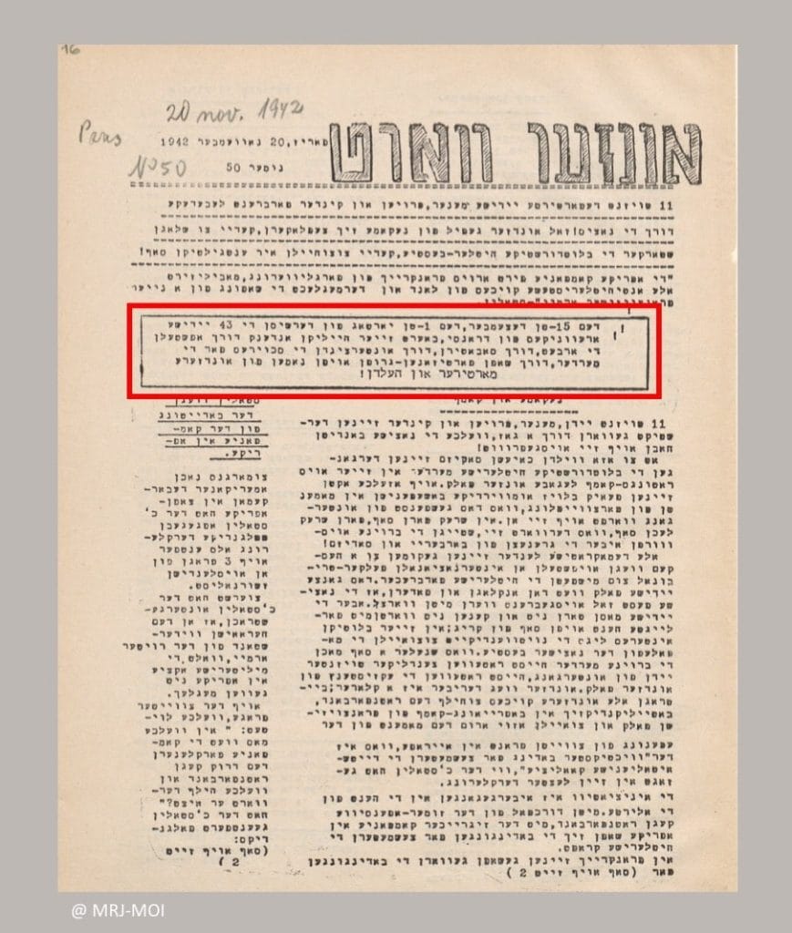 dénonce l’extermination et appelle à prendre les armes : « 11000 déportés juifs hommes, femmes et enfants ont été asphyxiés par du gaz, que les bandits nazis ont testé sur eux ».
